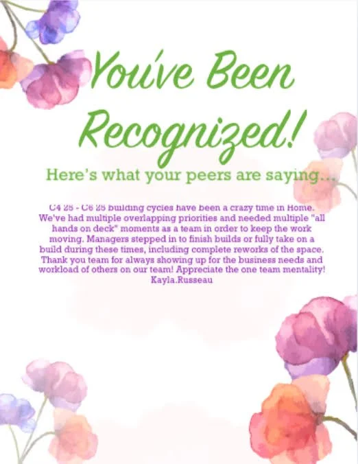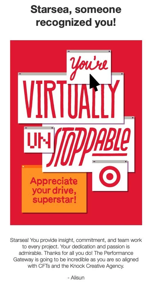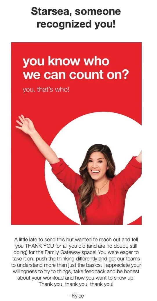 This section has a handful of recognition notes, I’ve received from peers + leaders, over the last few years. These notes speak to either my character, my competencies, my impact as a partner + team member, or success of jobs well-done!