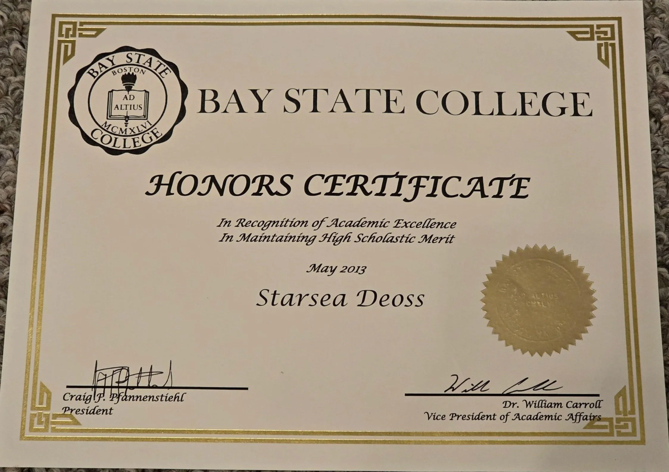 I was on the President’s List every semester that I attended Bay State College, from 2010 - 2013. Could not find all certificates though.