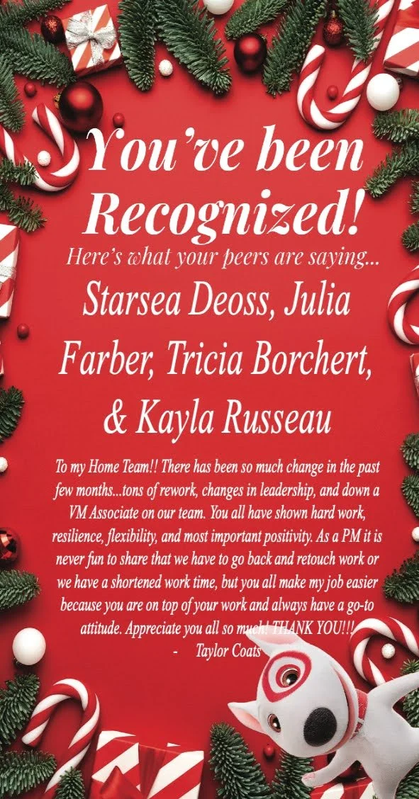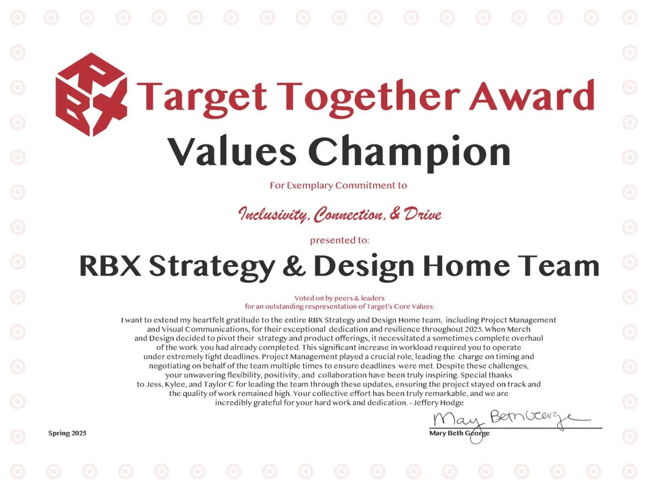 Presented to the Home team for demonstrating Target’s core team values of Inclusivity, Connection, + Drive.