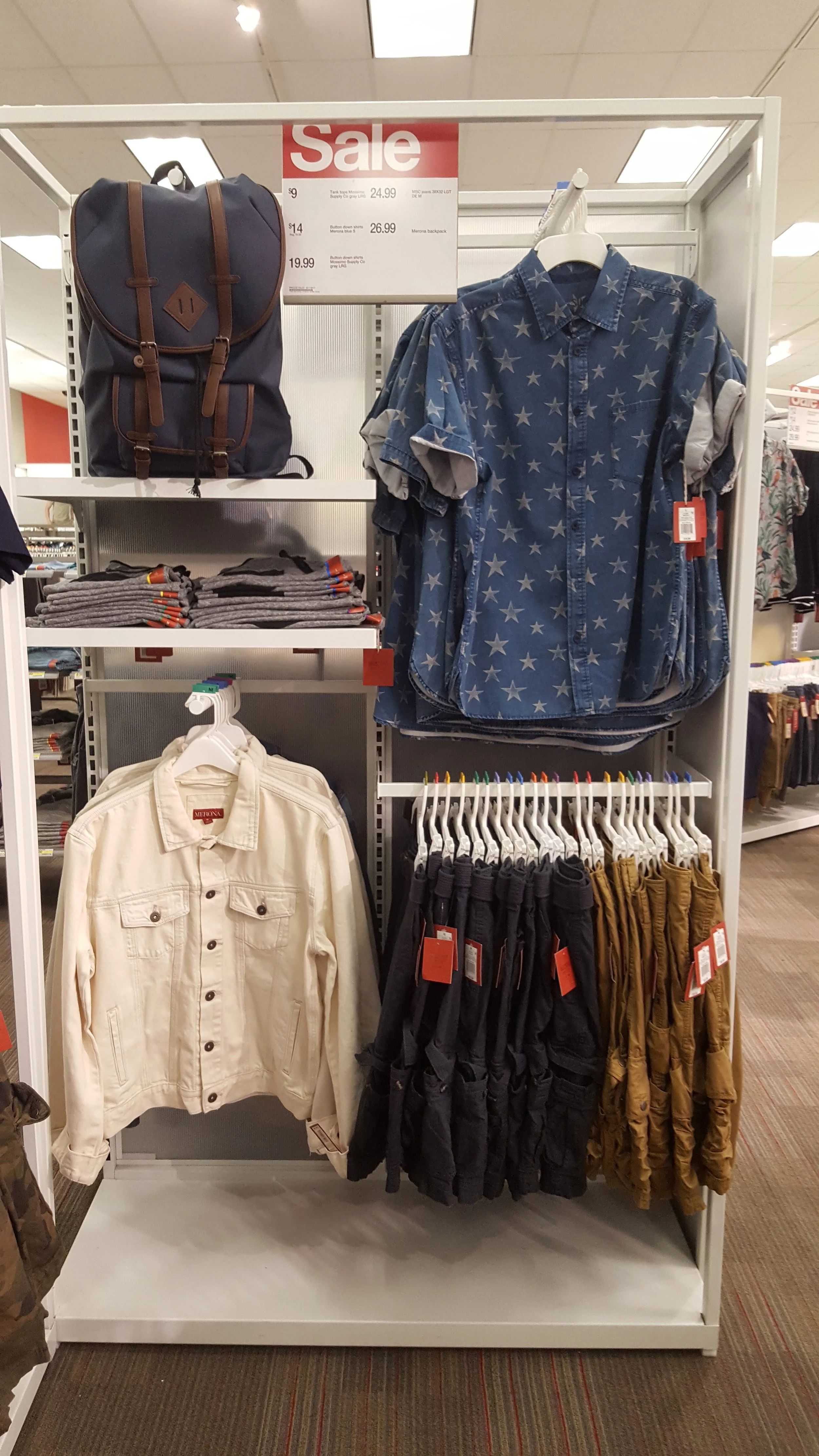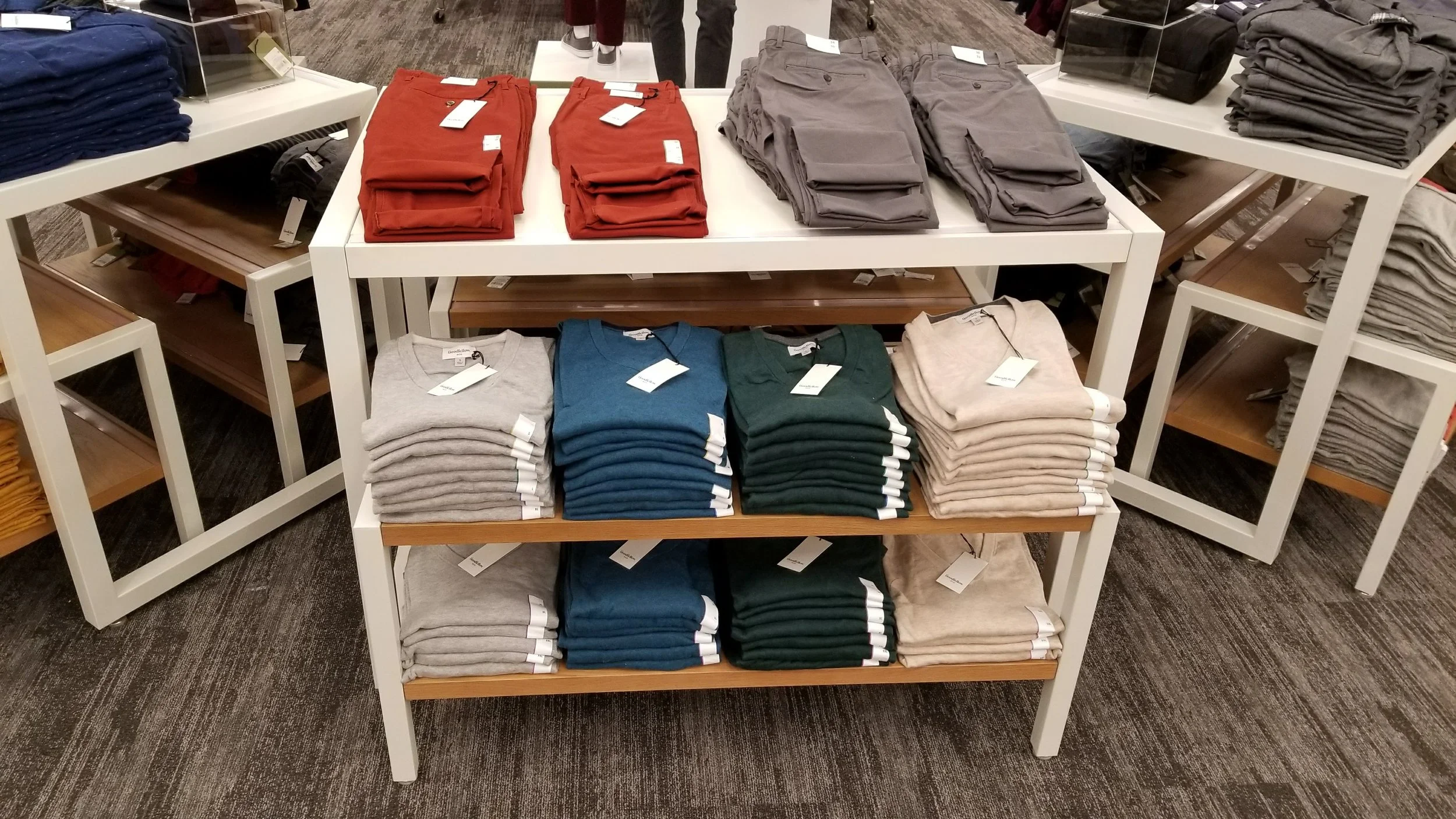 When Visual Merchandising for Target was first stood up, we only had one small room at HQ to set samples of items live + test out merchandising presentations. With so many floorpads and brands to accommodate in that one space, there were many times we needed to go into stores and play around with existing product to refine what the Goodfellow & Co brand launch experience should be. Below you will see some examples of those first store visits, testing out merchandising techniques, form usage, pant fold styles, + the use of cross-merchandising in the space.