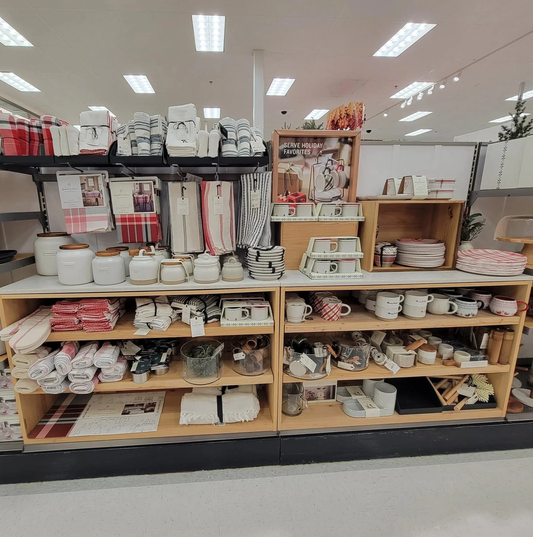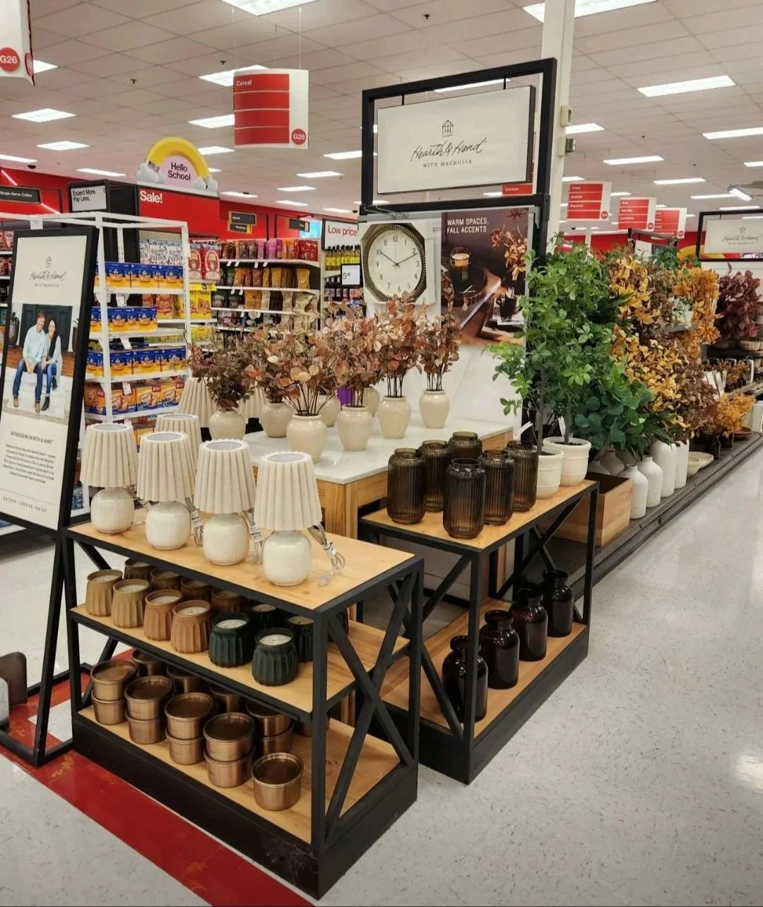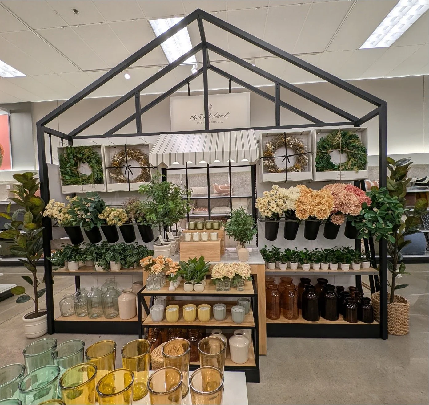 In 2023, when I was promoted from Visual Merchandising Business Partner to Visual Merchandising Manager, my category ownership shifted slightly. I became the Manager over our main Home Decor partnership brand: Hearth + Hand with Magnolia, a partnership with Joanna + Chip Gaines. This space in a Target store is its own floorpad, similar to how the HI Flat is structured, however it has its own unique fixtures, hardware, + fixture accessories to leverage. In addition, the Visual Merchandising in this space leans more heavily curated + the merchandising techniques used to set the space need to be intentional + differentiated from those of the HI Flat for bold brand recognition + distinct styling differences across brands. Managing a space I hadn’t been the visual merchandiser in prior was a nice new challenge, as I had to learn the brand, partnerships, celebrity nuanced preferences, + manage a business new to me. However, managing a space that I hadn’t merchandised in prior was also a blessing because it allowed me to come in with fresh eyes, challenge the status quo of what had been done in the space prior, + propose new ideas to keep the space innovative + fresh. I also had the benefit of working on the HI Flat prior + was well-versed in the brand expectations and merchandising techniques being leveraged over there, which helped ensure the progress made in Hearth + Hand would remain differentiated + unique to the space. During my time Managing Hearth + Hand, we integrated a handful of brand partnerships into the space, inclusive of: KitchenAid, Stanley, Owala, Haden, + more! We also launched a Hearth + Hand packaged food + giftable food line: Magnolia Table, that was then cross-merchandised within the space to amplify further storytelling + build-the-basket even more!