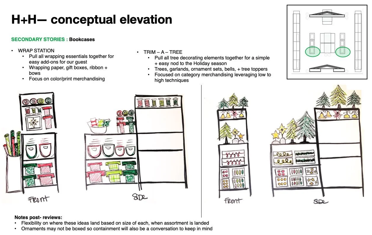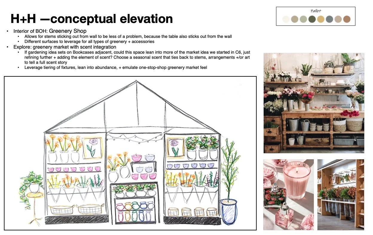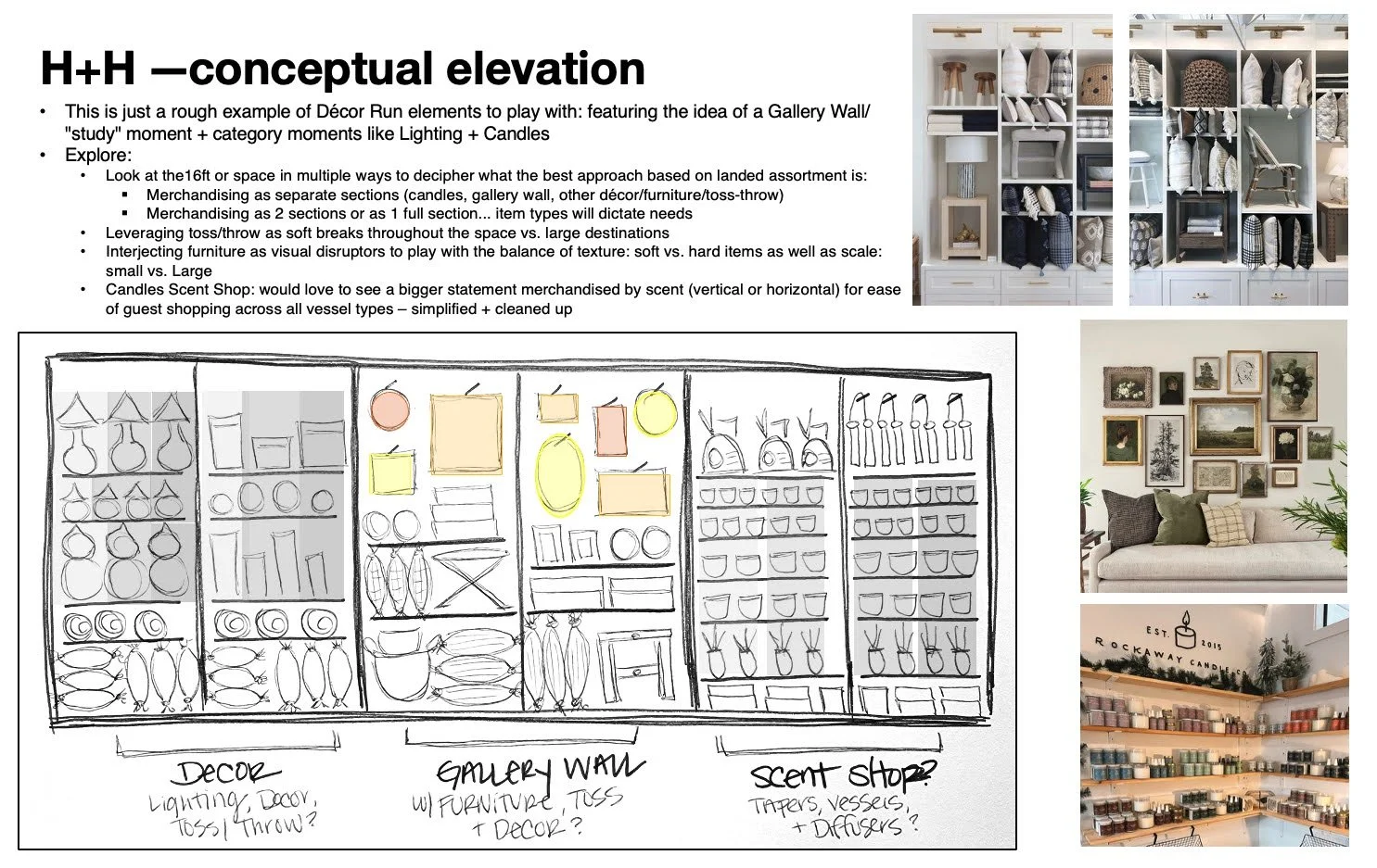 As mentioned above, part of the work I did in the Manager seat on Hearth + Hand was to refine the floorpad and help balance out what zones in the space played into curation vs. which zones became more key-item or category dominant in visual merchandising projection. Carving out intentional spaces on the floor to be category statements not only simplifies the guest shopping journey, but it also gives a moment of reprieve from the discovery in the space… a moment to pause and have clarity or refresh your shopping energy to continue exploring + discovering. Below are two very important examples of initiatives I lead to unlocking better category dominance in the space: creating a Greenery Shop + expanding out a Fragrance Destination. While both of these zones became bigger hubs for these top performing category moments, there was still room to play— as you will see below. The idea that a Greenery shop could still infuse a small nod to cross-merch, potentially, by leveraging a seasonal scent drop-in to the shop. This concept was to have a small/subtle way to refresh a heavily carry-forward space and interject seasonal relevance. This would also help amplify the zone + seasonal projection further by playing on multiple guest senses! Creating a main destination for top performing categories like Greenery + Fragrance, did not mean that these categories could not be leveraged in other zones within the space. Both Greenery + Fragrance were leveraged in other zones as a cross-merch element or as a way to round-out storytelling for certain trend moments, but both category destinations still stayed intact as the primary hub(s) for these category heavy-hitters! Below you will see my concepting work: inspirational swipe, sketches, + renders of these 2 main destination wins!