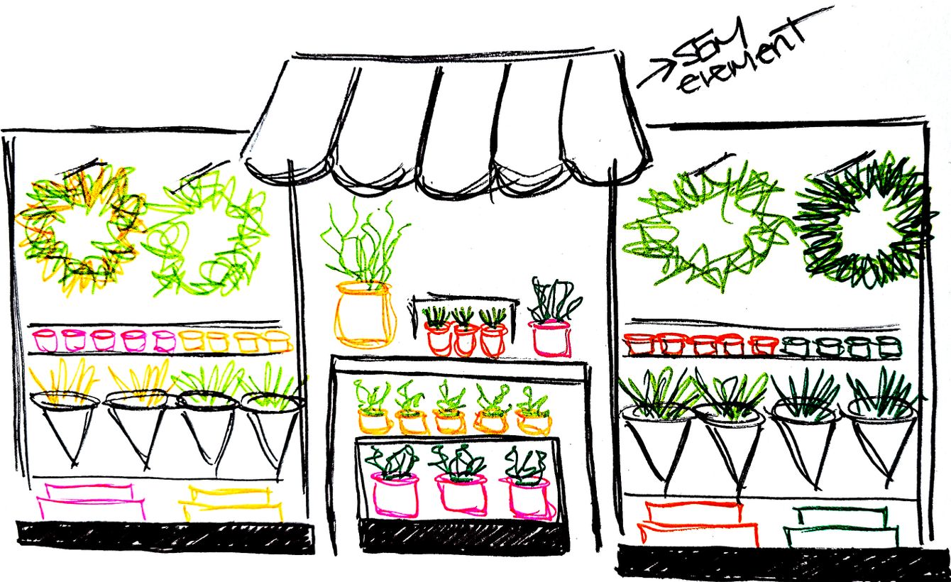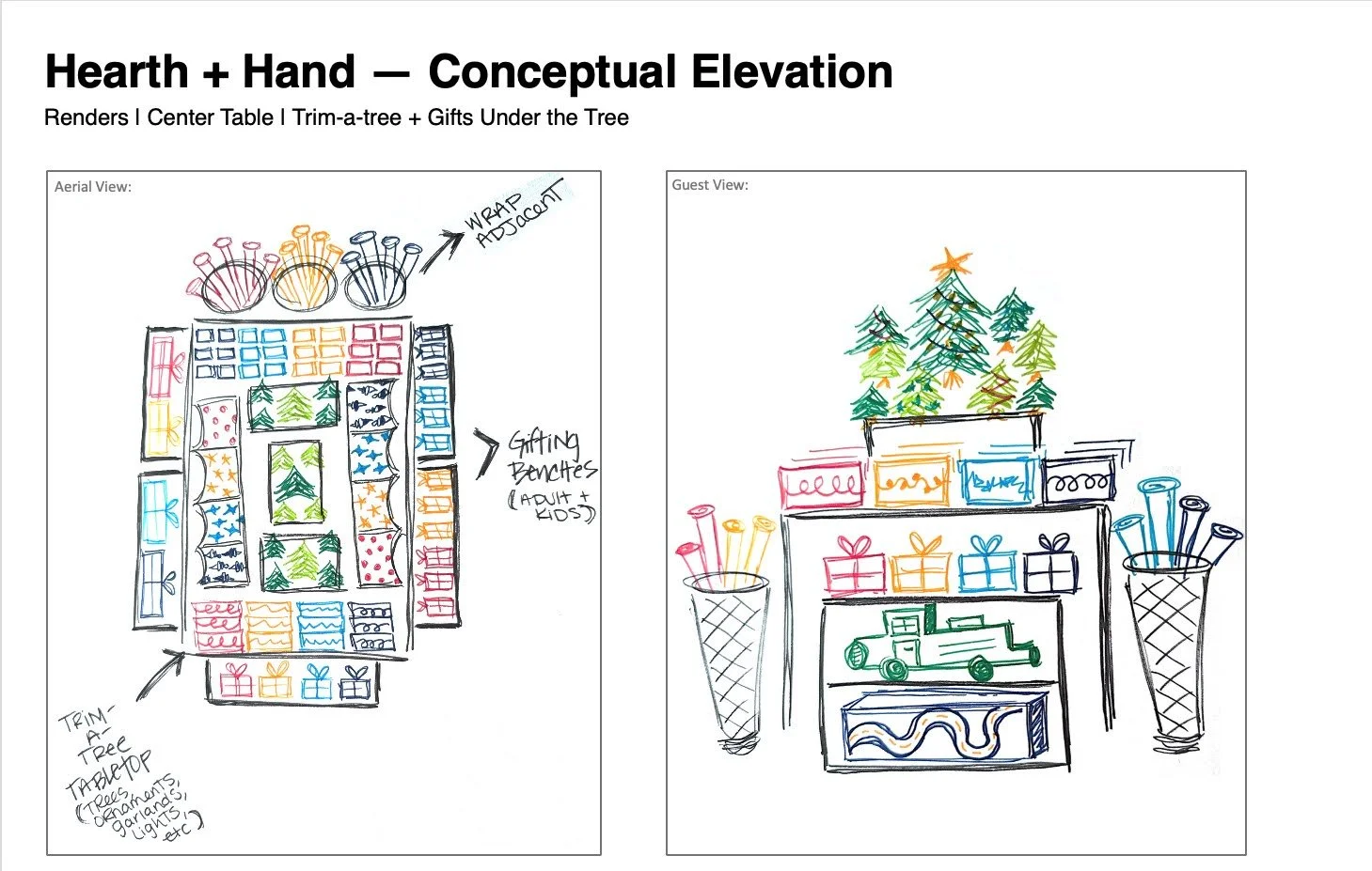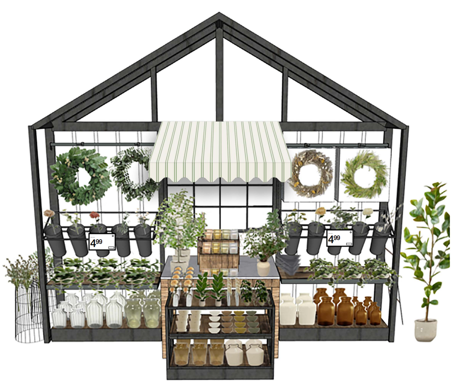As mentioned above, part of the work I did in the Manager seat on Hearth + Hand was to refine the floorpad and help balance out what zones in the space played into curation vs. which zones became more key-item or category dominant in visual merchandising projection. Carving out intentional spaces on the floor to be category statements not only simplifies the guest shopping journey, but it also gives a moment of reprieve from the discovery in the space… a moment to pause and have clarity or refresh your shopping energy to continue exploring + discovering. Below are two very important examples of initiatives I lead to unlocking better category dominance in the space: creating a Greenery Shop + expanding out a Fragrance Destination. While both of these zones became bigger hubs for these top performing category moments, there was still room to play— as you will see below. The idea that a Greenery shop could still infuse a small nod to cross-merch, potentially, by leveraging a seasonal scent drop-in to the shop. This concept was to have a small/subtle way to refresh a heavily carry-forward space and interject seasonal relevance. This would also help amplify the zone + seasonal projection further by playing on multiple guest senses! Creating a main destination for top performing categories like Greenery + Fragrance, did not mean that these categories could not be leveraged in other zones within the space. Both Greenery + Fragrance were leveraged in other zones as a cross-merch element or as a way to round-out storytelling for certain trend moments, but both category destinations still stayed intact as the primary hub(s) for these category heavy-hitters! Below you will see my concepting work: inspirational swipe, sketches, + renders of these 2 main destination wins!