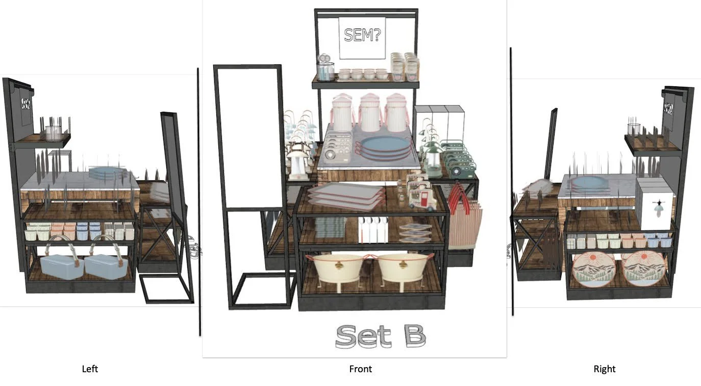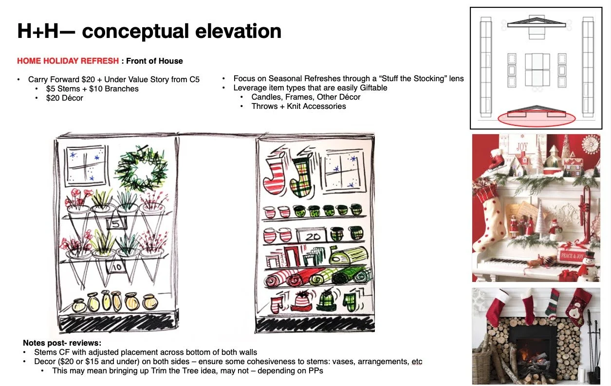 When I joined the Hearth + Hand team, Visual Merchandising was already operating as a part of this CFT (cross-functional team). The space already had established zones for the floorpad + routines for the flow of the work + partnerships. However, there was still a lot of room for improvement with respect to: partnerships with the Merchant team for them to understand fit, capacities, + lean into fewer, deeper, bolder assortment strategies to protect curation + storytelling intention within the space; merchandising potential of curated moments to tell clearer trend stories with a stronger point of view; balancing out the space with some key item destinations to lighten the load of how much curation was happening in the space, to better ease the guest shopping journey + simplify the experience in the space; and developing my direct report to understand not only her merchandising hand but also land the merchandising technique differences unique to Hearth + Hand, to leverage for this brand vs. other spaces in the store. This section leans into some of the cyclical work I did as the Manager on Hearth + Hand. Below are some of the cyclical builds I Managed, inclusive of the up-front concepting work I created, to pass off build strategies + visual merchandising direction to my business partner, to set her up for success with merchandising builds. Again, as we refined the processes of how Visual Merchandising shows up for the Home division and Target as a whole, you will see that the overall approach to concepting work evolved! This evolution explored many ways-in to communicating + bringing the space to life through: a mix of inspirational swipe compiling + curating, CAD planning + mapping, and illustrating + rendering.