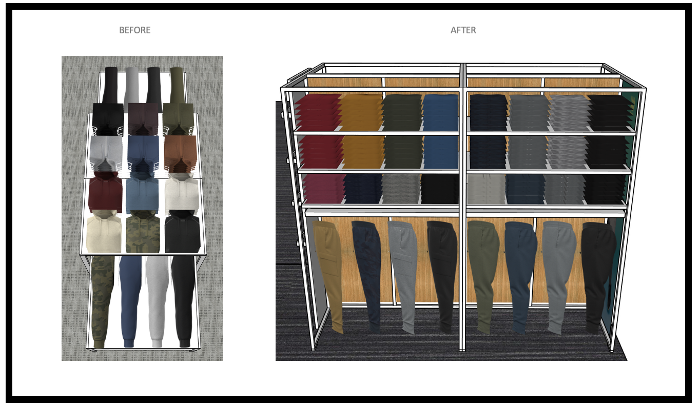 This is a simple, but effective, example of influencing. From my time in A+A for Activewear for Men’s, we had a lot of legacy programming that were tried + true collections the guest knew they could rely on us for, and they had been merchandised the same way for so long, the guest also knew exactly where on the floorpad to find them. During my time on this desk, one of these legacy programs: our 80/20 Cotton Hoodies + Joggers, went through a re-vamp of fabrication and style. In this improvement process, for a better hand-feel + cozier set altogether, remaining on-trend, there was appetite to grow this program: introduce more colorways, more styles/fits, and lean into depth behind the buys in a bigger way. In order to accomplish all of that in-store, we were not going to be able to support the growth needs by merchandising these items on the same fixture we had in the past. In order to suggest a new merchandising solve to the team, I’d need to leverage that influencing skill to get the team onboard with changes to our visual merchandising strategy for us to successfully accomplish the asks. This meant changing floorpad location + fixture usage for these items. I knew I needed to approach this in a way they could follow along with + better understand growth potential, so taking the time to quickly render the new space with the proposed assortment would give the group a visual example to better understand the proposed shift. This render would then showcase the unlock of leveraging a different, more flexible, fixture type and illustrate the variations within hanging + folding product and how that could ebb and flow what we did in the space from an impression and depth standpoint. In this example, we were able to increase capacity behind our top hoodie style, add additional colors behind it, and bring in another top style, for 3 top fits vs. just 2. This exercise then also allowed me to illustrate during the conversation how we can adjust those counts depending on the merch assortment strategy needs: folding down the pants to afford more unique styles or additional colors or even more depth to fit on these fixtures at peak times. Knowing how to illustrate the visual techniques needed to compliment the necessary anticipated dialogue helped influence the team to get behind the shift. Not only did this achieve everything the team wanted to do with assortment changes, it also supported the need for increased capacities while giving flexibility for those needs to ebb and flow, + it provided the guest a refreshed experience for a loved item that made it new again and more dynamic to shop ultimately increasing sales!