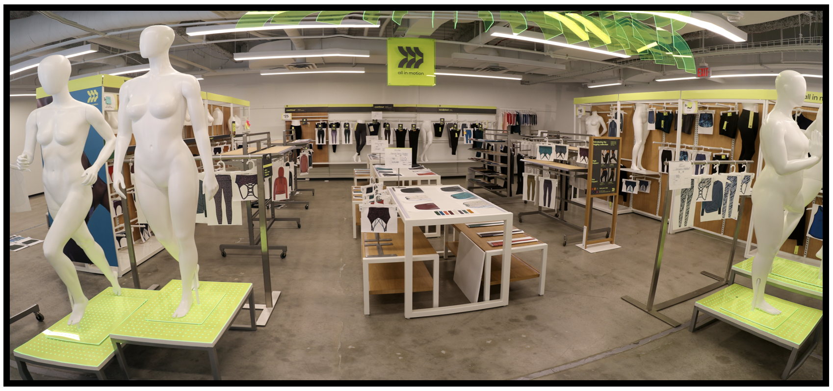 Eventually, the company decided it was time to own this space in a more authoritative way and we walked away from our partnership with Hanes on the C9 Champion brand, to invest in a Target Owned Brand instead: All In Motion. The above is just one snapshop of the Mock Store work that was done in those early stages of standing up this brand. In this image you will see the Women’s performance floorpad. My job was to figure out the right balance between clean + overt category destinations and special curated trend/end-use storytelling moments. Essentially where Fashion or “Must Have” impulse items would land vs. the Everyday or “Core” staple items could be bulked-out, and the overall fixture block in the space to achieve this. One of the key successful factors in this brand elevation was allowing the fixture block to showcase both of these moments from the main aisle, so at quick-glance the guest could see we were offering them BOTH core and fashion items. Then from there, once we’ve grabbed their attention, leading in the space with the most exciting fashion and on-trend items to start getting them to explore, touch + feel. It was intentional in this zoning of space to created core destinations for both Leggings + Bras, the top 2 categories for Women’s Performance, where we could bulk-out all style and end-use needs for the guest to see their options holistically, and then have them surround the space to act as clean and authoritative back-drops to the shop. Each of our category destinations were organized in clean + overt ways based on guest shopping behaviors. For leggings, it was by material that correlated to end-use needs (Contour/everyday, Sculpt/active, etc), and within each fabrication was the range of fits. For bras, it was more important to be arranged by support level needs (low, medium, high), then by strap style within those support levels. Both of these destinations were supported with key signage to help navigate and educate the guest on their options, to ensure they could confidently make the right choice for their desired end-use needs! Another key factor in the overall elevation of the space was leveraging + balancing display enhancement options: Mannequins, Bust + Leg Forms, and Displays. Re-inventing the mannequin package to be more inclusive to all guests from both a body-type perspective to an activity-level standpoint. Strategic usage of forms to compliment the guest education of styles and fabrications, while also providing balance throughout the shop where inspiration is trickled throughout.