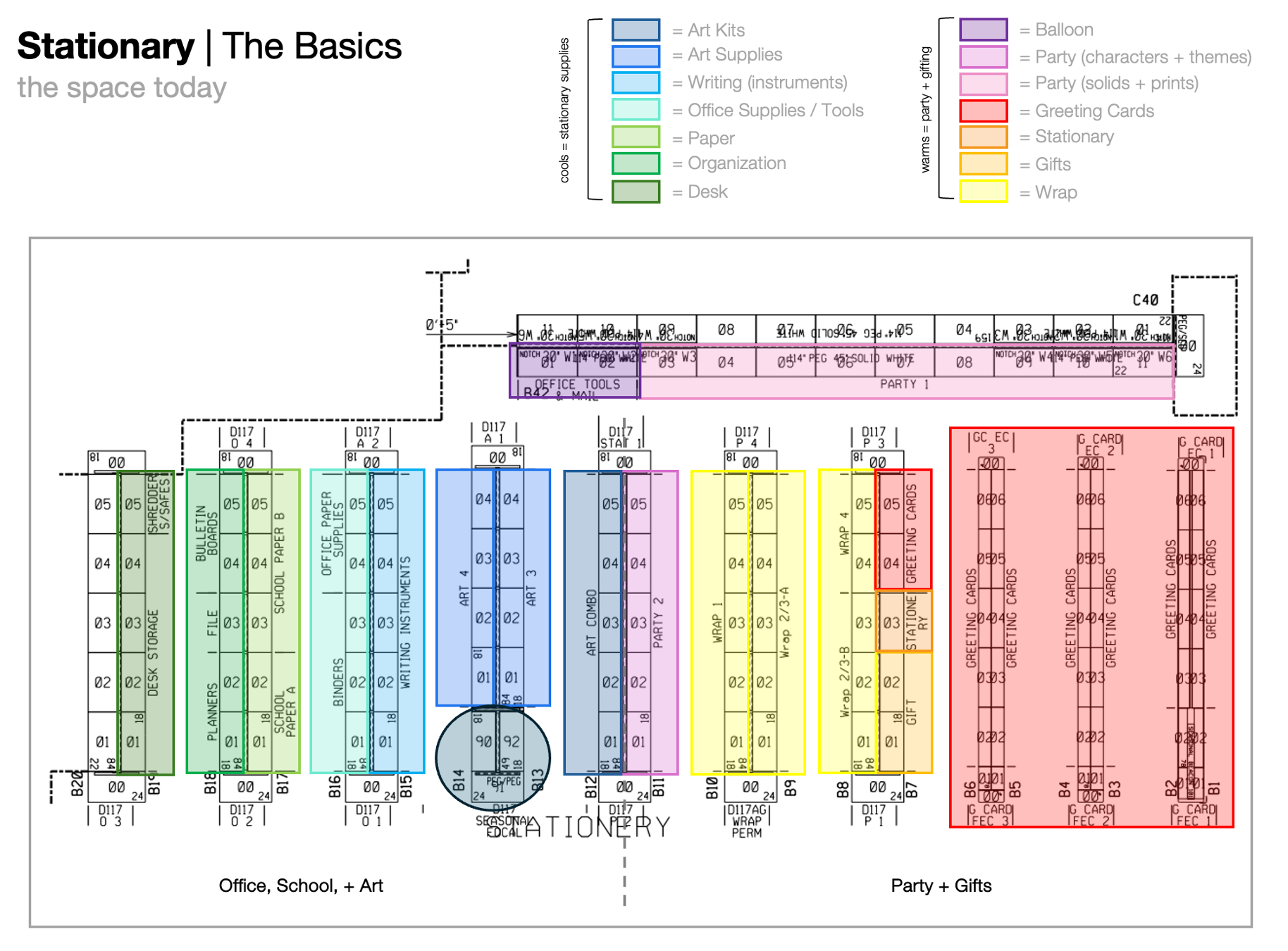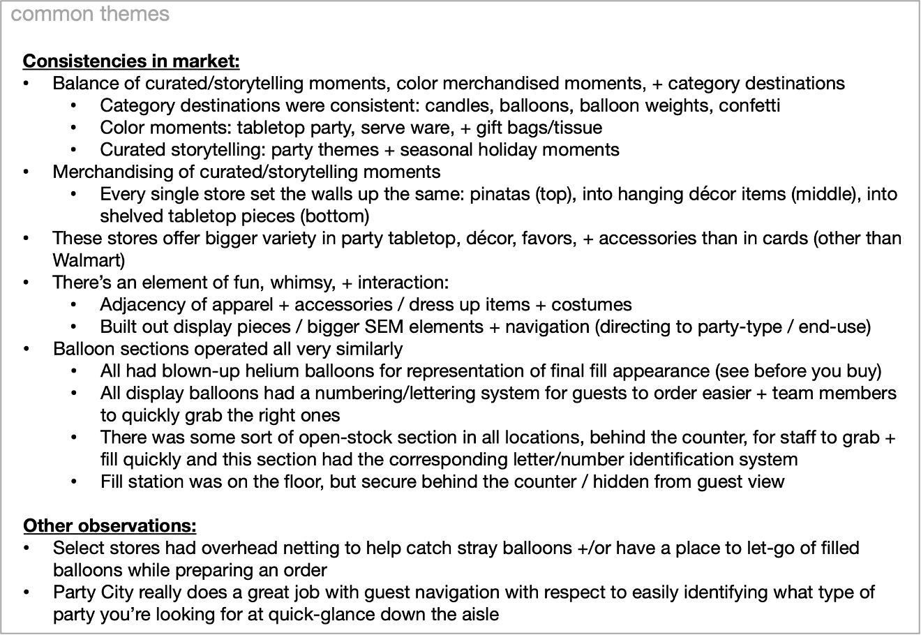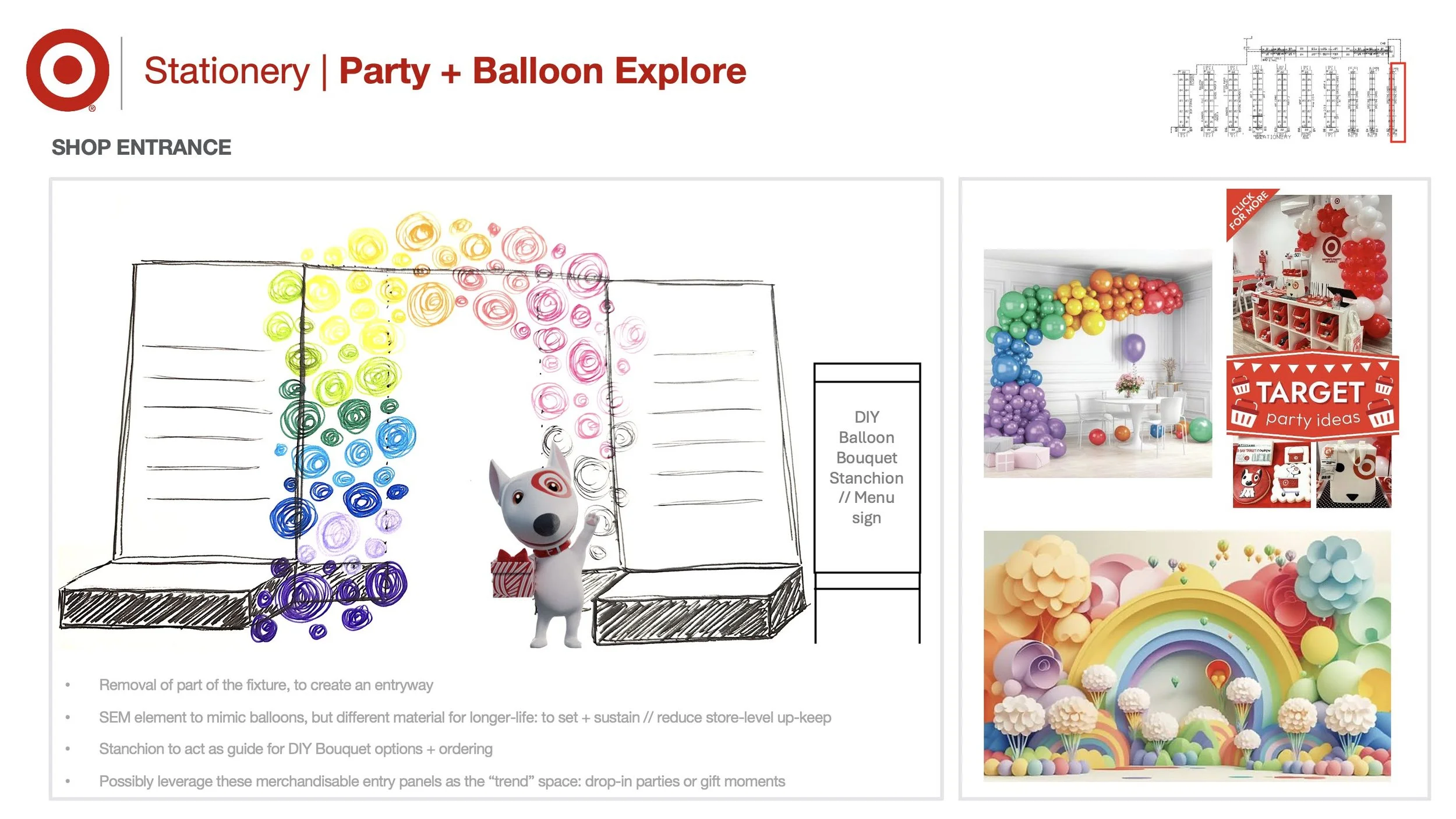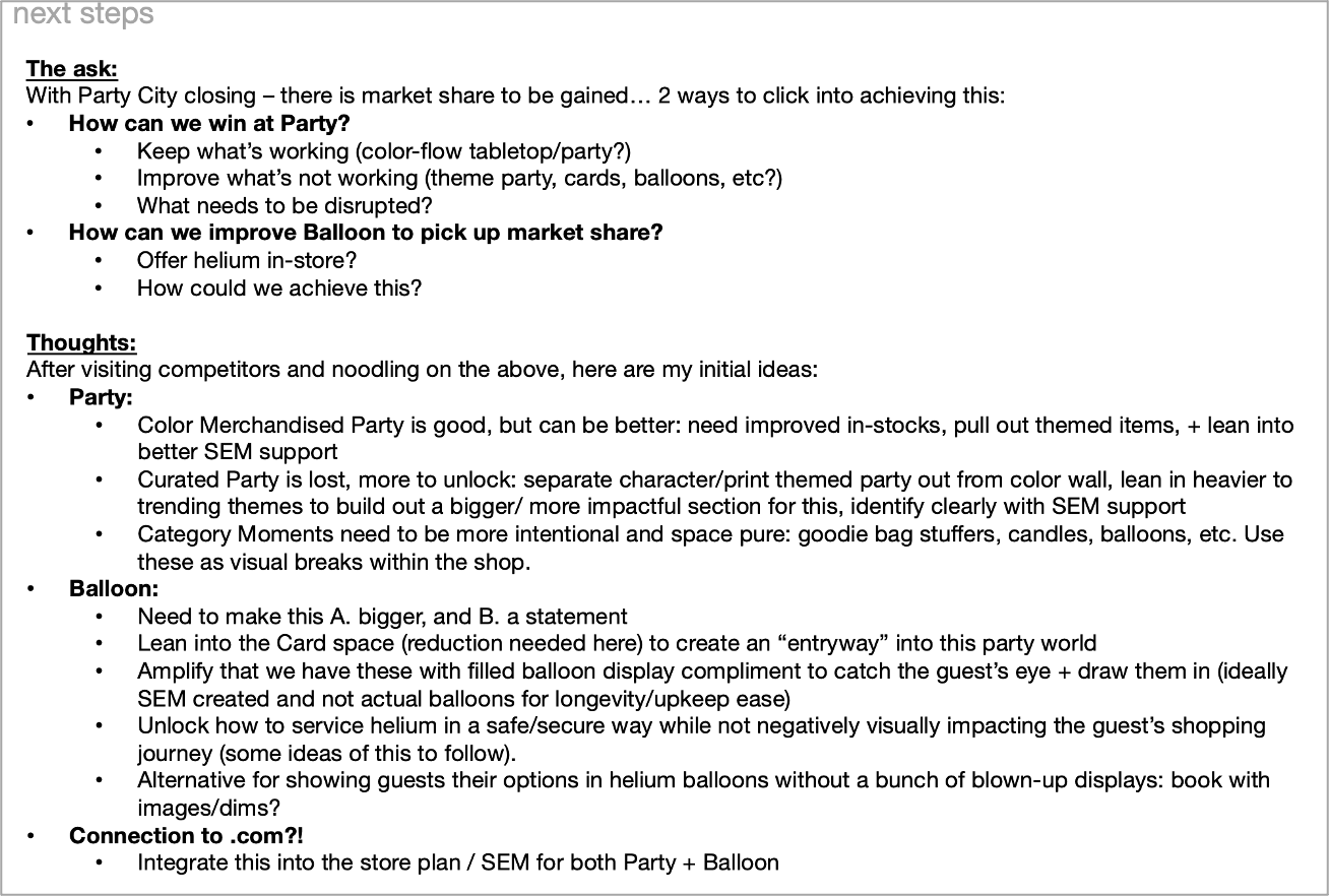 When I first joined the Stationery team, there was no scope of what this work would look like or what it should entail. That open-ended exploration was awesome. It allowed me to really dive into learning what is currently in the market, how are we showing up, is it competitive, where are we lacking, + then allowing for a dream-state (so-to-speak) of possibility. First day on the business, and there was no time to waste. RBX hadn’t been given any direction from the Merch team yet of wants + needs for evolving their space to work harder for them (that information would come at a later date!) but RBX leadership was hungry to have us show up in a way that was impactful + proposed some new ideas to get the team comfortable with being uncomfortable. Because of this, I was tasked immediately to just run: learn as much as I could about the businesses: Stationery as a whole, as well as Party specifically, understand what big Party retailers are doing (what’s working + what’s not), understand what our direct competitors are doing (similar or different than us), then DREAM. The goal was to take all learnings, the good + the bad, and understand what we should + shouldn’t do to Win Party… but also take these learnings + dive into a dream state of concepting that could translate what Winning Party would mean to Target specifically. How we could improve the guest shopping journey + be leaders in the industry within the Party space. The added nuance to this work was the fact that Party City had just announced they were closing their doors, and there would soon be a LOT of market share on the table to be scooped up— ideally by Target. Unfortunately, with Target’s workstreams + overall timelines, as well as set transition limitations— this work would not come to fruition immediately and would need to be a phased approach. Below you will see some of this Winning Party work. The current state of the Stationery adjacency, and some potential shifts + proposals mapped out based on learnings. I had pulled together about a 50 page deck of competitive swipe images + learnings, but below you will only see a snapshot of that. From those educational trips + learning insights, I then proposed some mapped shifts to the adjacency, as well as rendered out potential adjustments to the way we look at the space today. Some of this is also inclusive of the idea of introducing Helium Balloons into stores as well, which is the 2nd project you’ll learn more about in the following section. The images shown below are the very up-front work of data gathering + first-pass ideating. The Stationery business will not be able to effect a major space change due to workload hours + process limitations until 2027, so unfortunately I may not see this project all the way through to fruition. But, I am proud of the upfront work in kicking off such a massive potential shift in the way Target’s Stationery world operates!