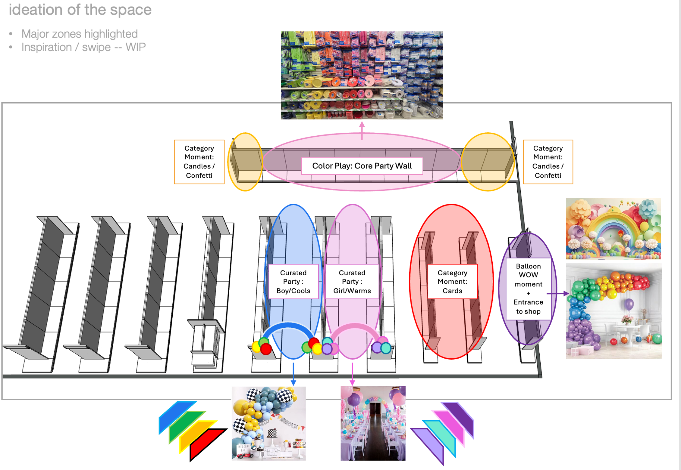 Stepping into the Stationery world and trying to solve for how we introduce the Visual Merchandising Operating Model + working streams into this area, has been complex but also exhilarating! It is extremely rewarding to be trusted as the point person to lean in and lead the work of how we improve efficiencies, as well as being trusted to advocate for what our best way-in and overall approach to standing up a new capability in an existing business can look like. We are not yet where we want to be for this evolution of the Stationery division, but there has been a lot of great work done to get us on the right path. From learning new CFTs, becoming a valuable voice at the roundtable, gaining trust with new + hesitant partners, and disrupting the current work-streams to encourage new ways of working, to challenging the status quo, pushing the boundaries of what is possible, and advocating for developing first-to-market concepts that keep Target in the on-trend leader seat, the work has been fast + furious! Below you will see 2 examples of work-streams actively being developed: Winning Party (2027 and beyond) + Standing up a Helium Balloon capability (immediately/ 2025).